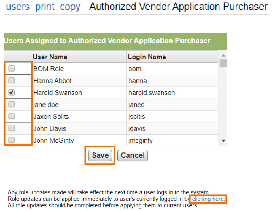 To immediately apply security updates to users currently logged in, scroll to the bottom of Security Roles and click clicking here.