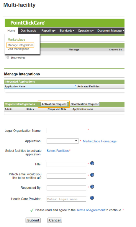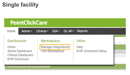 Complete your request to enable the How's Mom integration to PointClickCare.  Please note the correct menu location depends on whether you have a Single Facility or Multi-Facility setup in PCC.